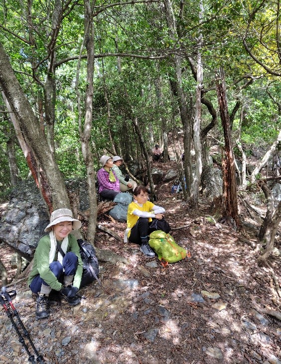 瓢箪崩山の今回のコースは登りよりも下りが長いコースです。自然林の尾根道をしっかりと歩きます。木々の間から日差しがありますが、時おり風が涼しくてやはり秋を感じました。紅葉はまだまだですが、立ち止まって水分補給をするとリフレッシュできます。途中リーダーお勧めの岩場で小休止を取りました。