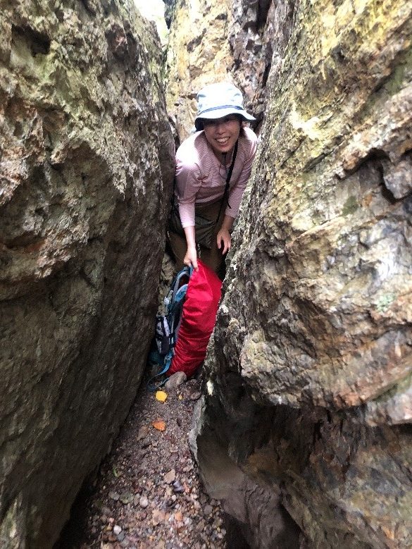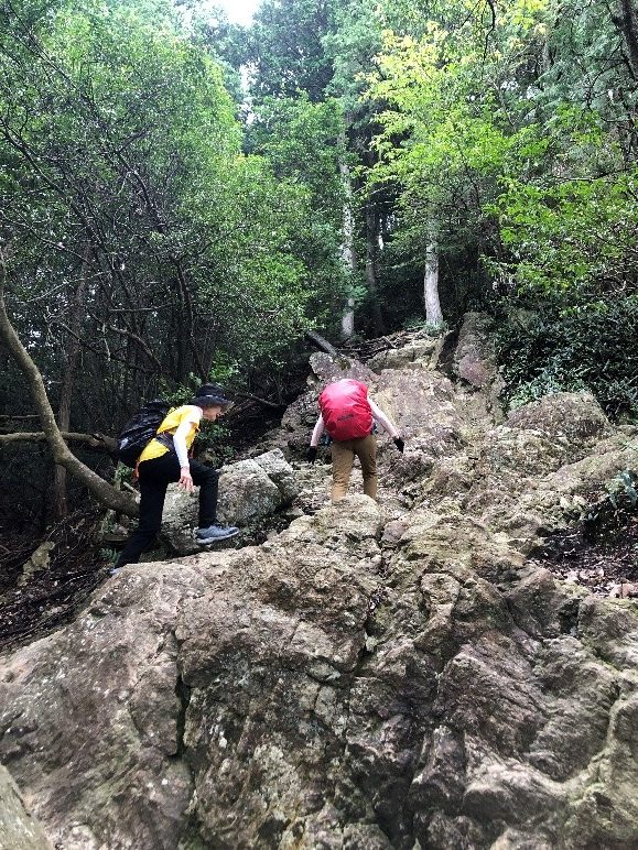 30分ほどでお楽しみの「割れ岩」に到着。メタボ、肥満度確認岩(笑い)と言われる巨岩の間にできた狭い割れ間を(狭いところは20㎝もない)無理やり?通るところで、横に普通の道もありますが、今回は3名が挑戦、鎖場の岩を登りザックを持ち上げながら、これ以上おなかが出ていると通れない(誰?)隙間を10メートルほど進みます。壁岩に凸凹があり大変でしたが肥満度OKで達成感もあり、楽しかったですが、ザックも服もこすれて孤軍奮闘の跡が残っておりました。