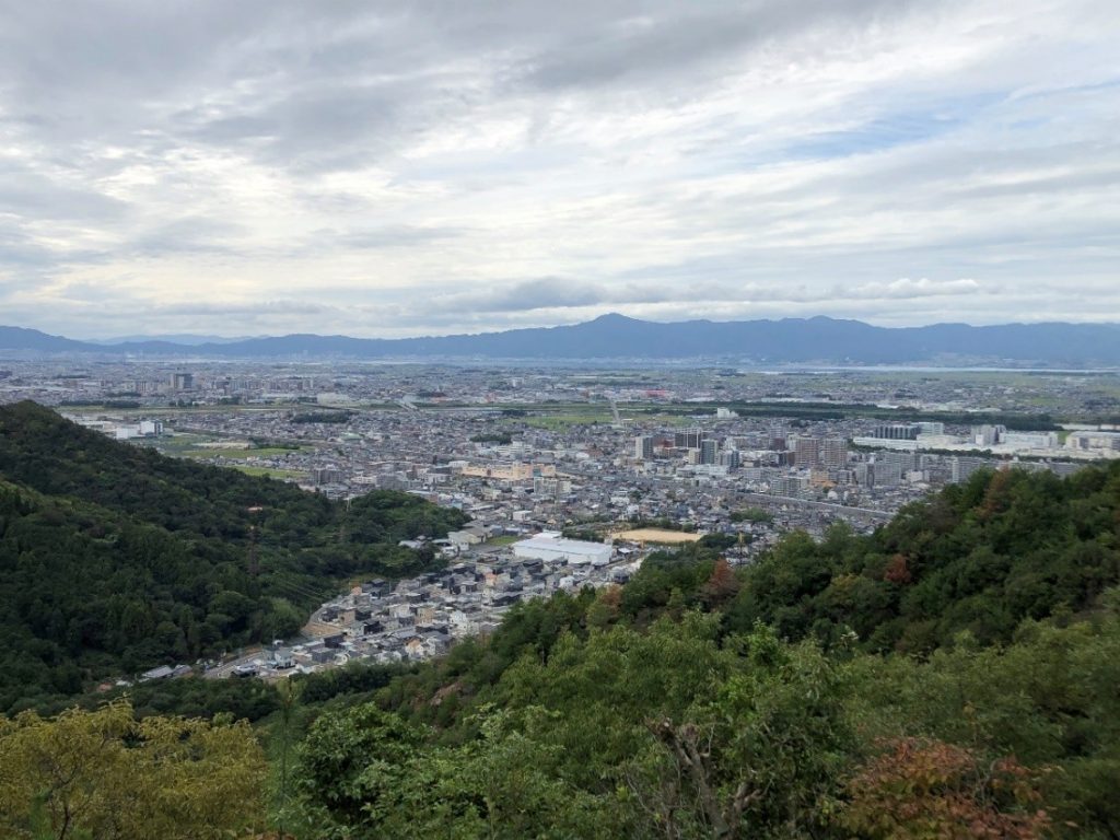 50分ほどで山頂手前の展望台に到着。近江平野や比叡山、西山の景色を満喫したら、すぐ上の御上神社奥社で皆さんの安全登山を祈願し、山頂広場で休憩と記念撮影して、健脚コースの根っこだらけの急坂を慎重に下りて北尾根への分岐に向かいました。