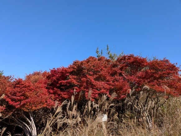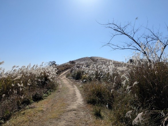 昼食はあかまつの丘で食べる予定になっているので、小休憩をしたら下山開始。同じ道を辿るのですが、逆から見ると一層ススキが綺麗に見えて登りでも写真撮ったけど、また写真を撮ってしまいます。土が少し滑りやすい急な箇所は慎重に下り、無事に下山しました。